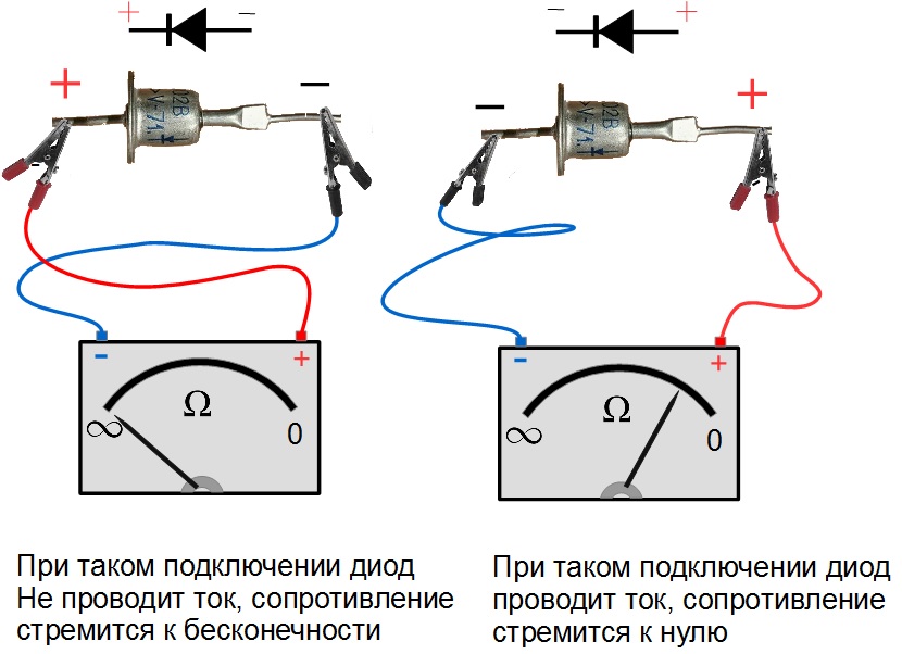 Если омметр при подключении к диоду показывает в обе строны бесконечность или в обе стороны ноль, то диод неисправен.