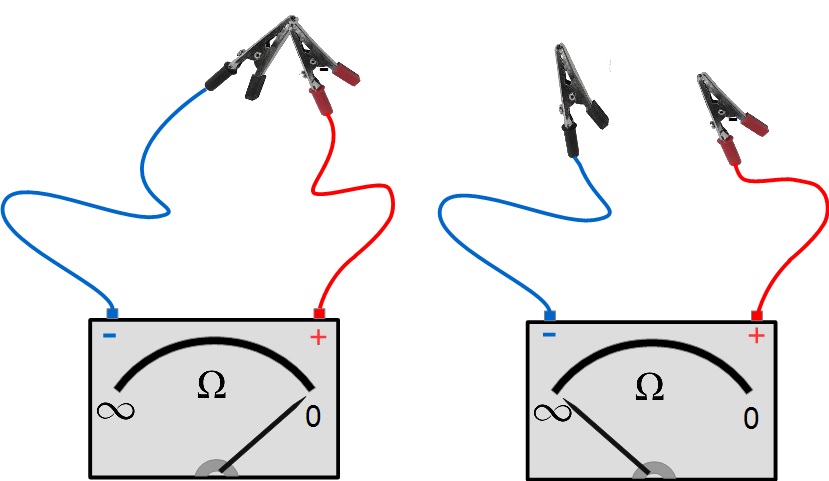 Если измерительная цепь омметра замкнута, он показывает ноль Ом, если цепь разомкнута, он поразывает значение - бесконечность